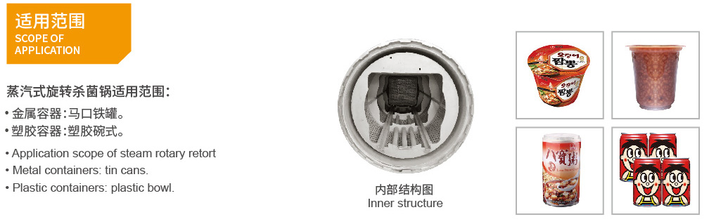 ? 特别适用于包装物中固体比重比液体比重大,及各种浓度不同的粘性灌装食品,使其在杀菌过程中